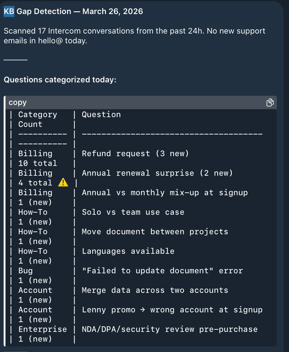 Every Friday evening, look over our resolved support tickets. If any question has been asked 3+ times this week: (1) flag it as a docs/FAQ candidate, (2) create a Linear issue and assign to @agent to add a docs page to/docs covering the answer, (3) include the standard answer you’ve been giving as a starting point in the issue description.