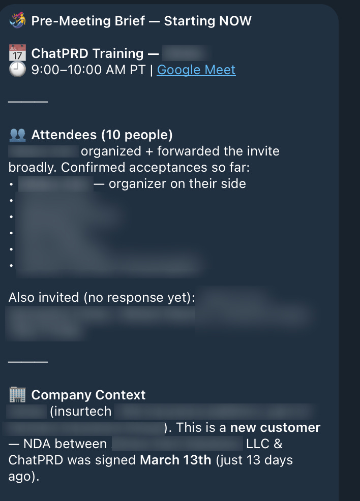 Check all my calendars for any meetings starting in the next 30 minutes. If there is a meeting starting soon, send me a pre-meeting brief on Telegram. Include meeting title and time, who’s attending, and agenda if available from the calendar event description, and our last interaction based on the most recent email thread or meeting notes with this person/company.