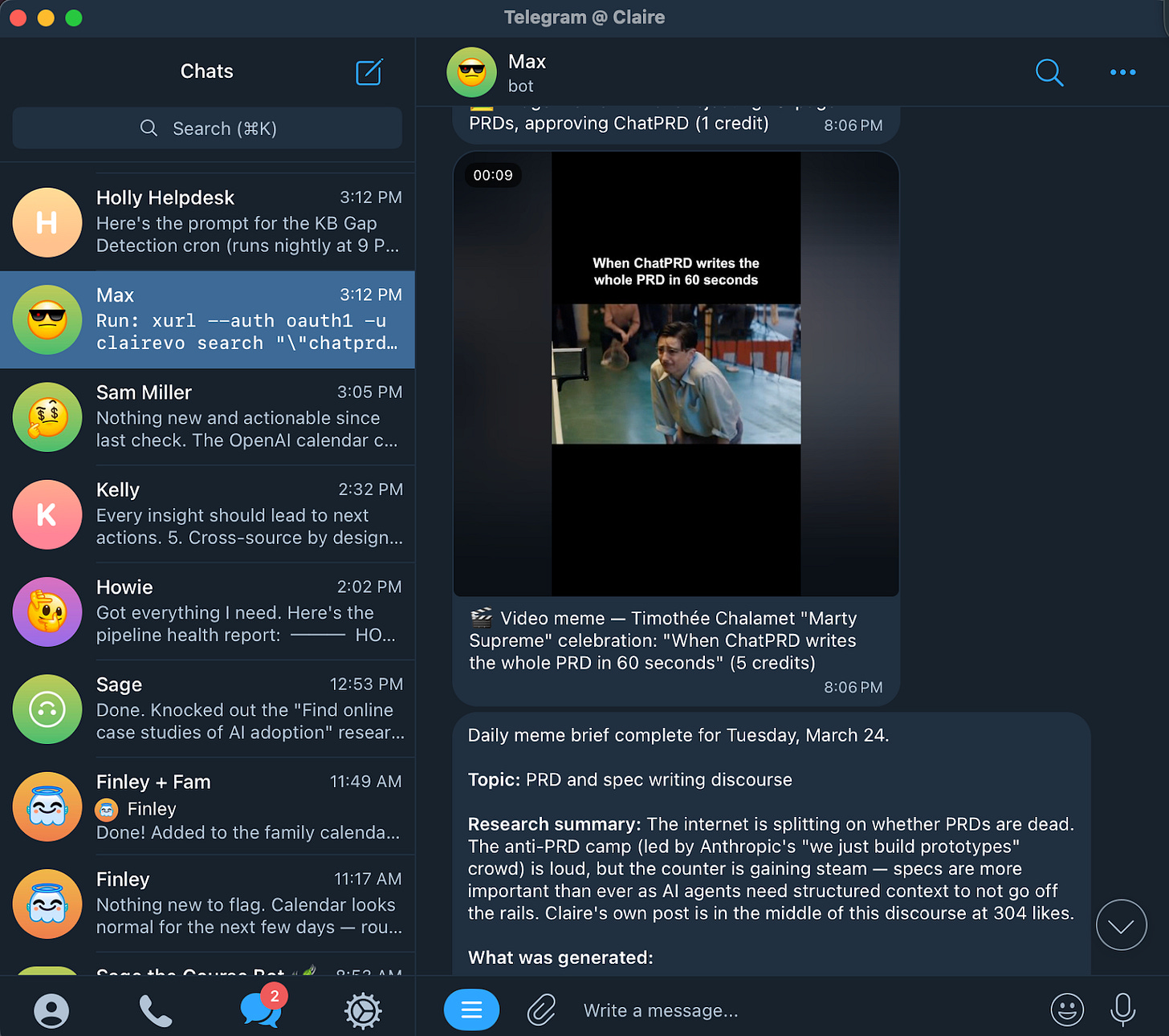 Helpful crons: 3x a day PM meme query on X, weekly review of blog content to repurpose for LinkedIn