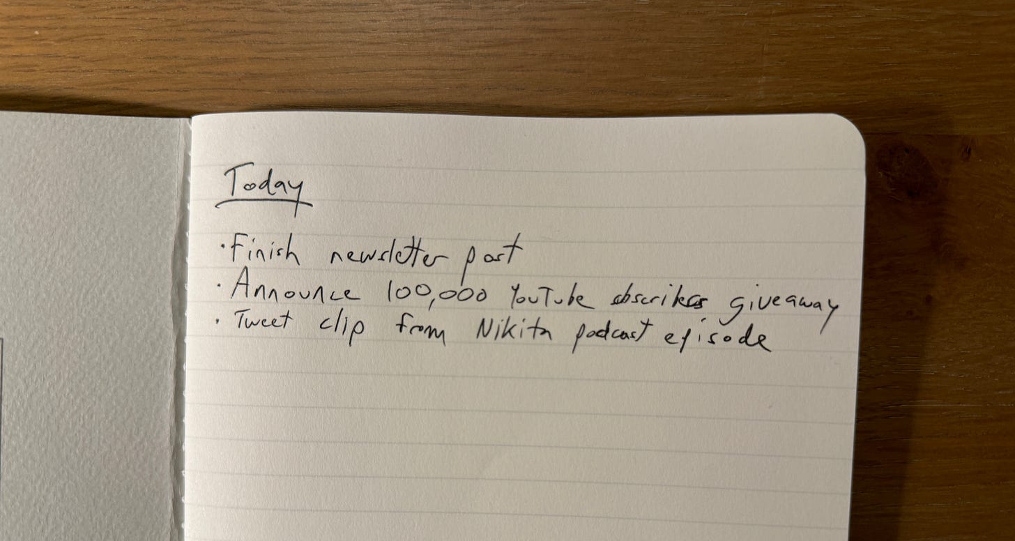 As a bonus, it also feels so damn nice to cross out a to-do physically, and tear out pages and throw them away. It may be irrational, but it’s much more satisfying than checking a checkbox in a to-do app.