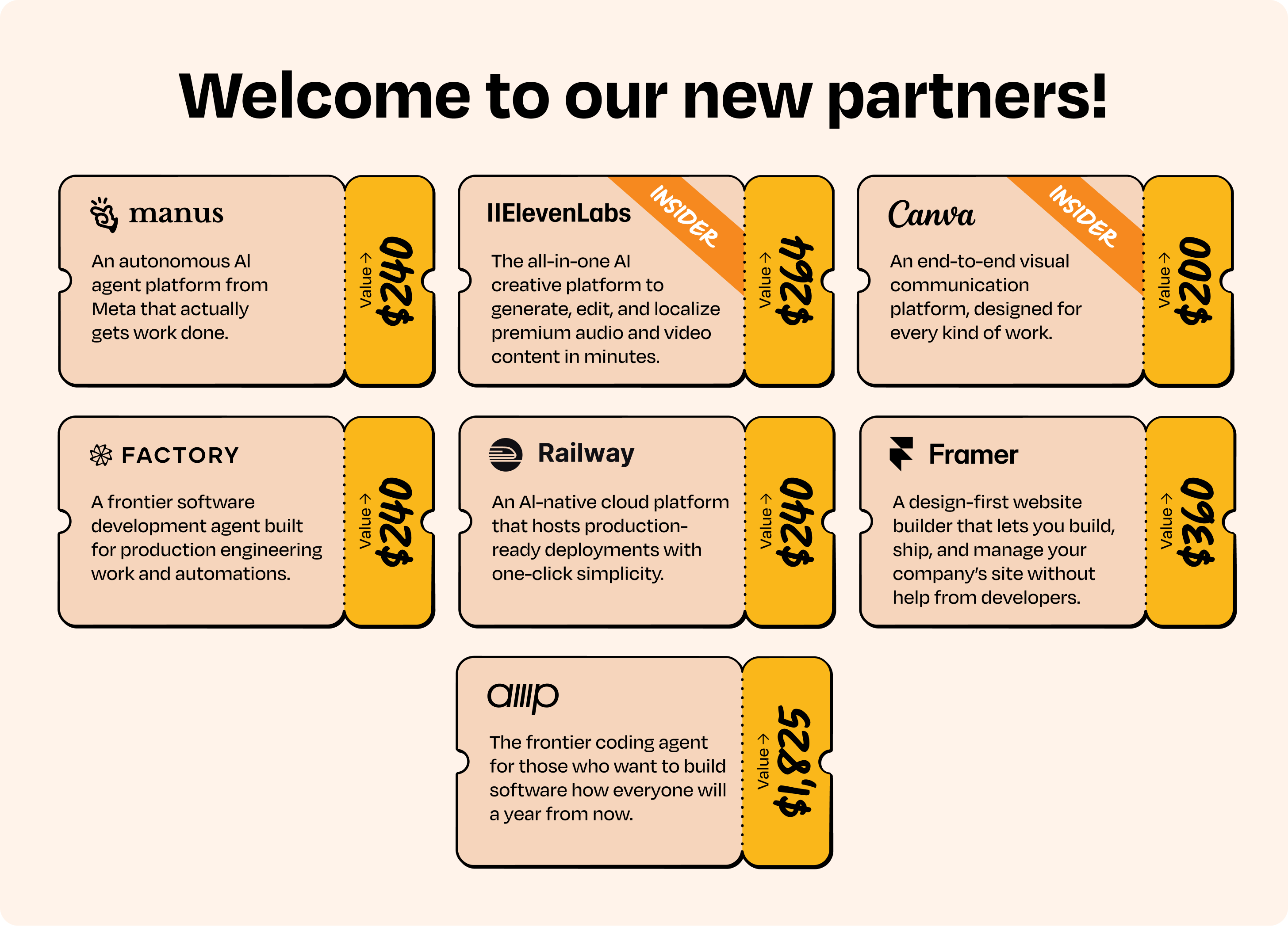 Product Pass drop: Canva, ElevenLabs, Manus, Factory, Amp, Railway, Framer—now free with your paid subscription