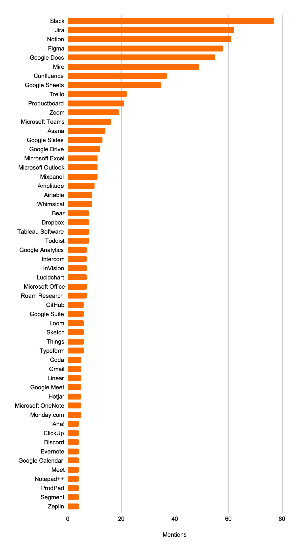 Surprises: Slack being the most mentioned, Miro/Notion/Confluence placing so high, Google having seven products in the list, and Microsoft five