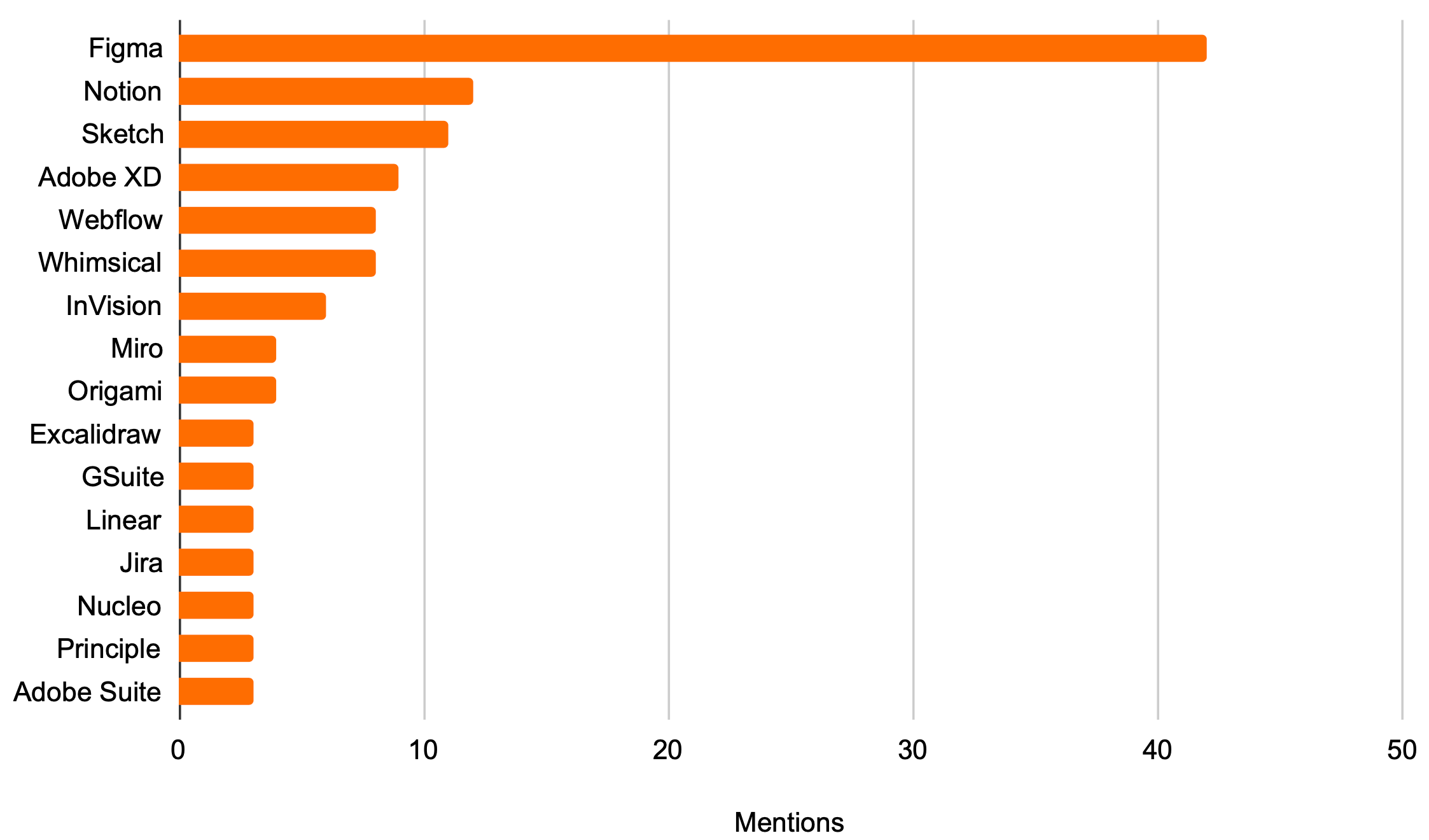 Surprises: How far ahead Figma is at this point, that Whimsical got more mentions than Miro, that Webflow had so many mentions, and that Notion continues to come up in these stacks