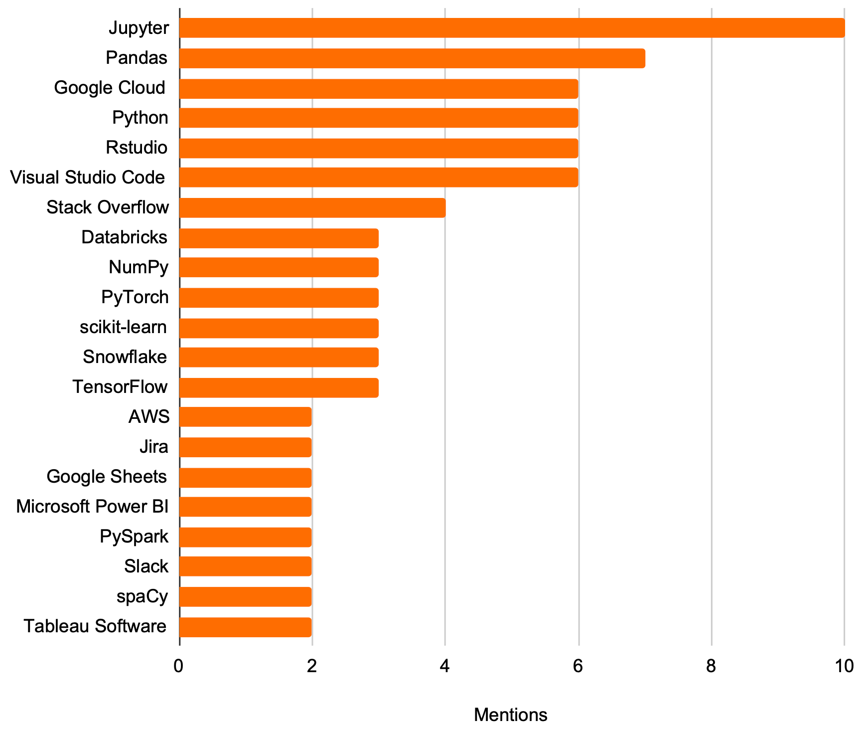 Most common: Jupyter, Pandas, Google Cloud, Python, Rstudio, Visual Studio Code