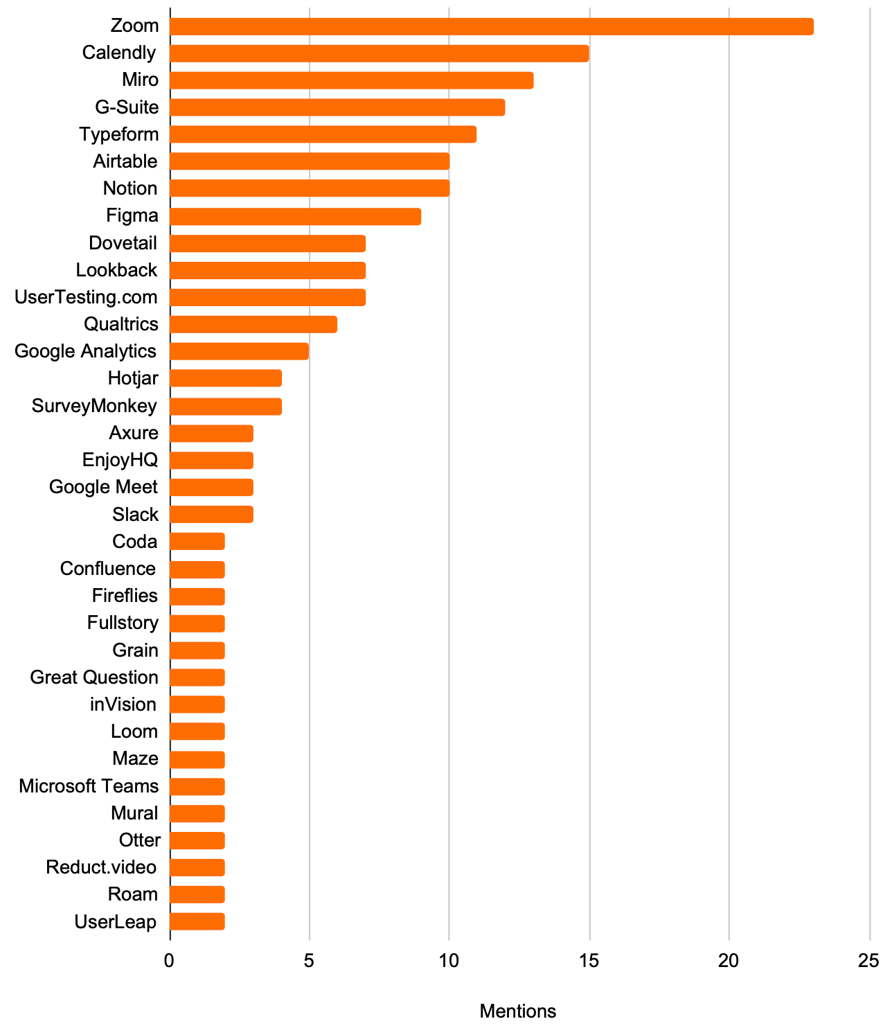 Surprises: How often Miro/Airtable/Notion were mentioned, that Zoom and Calendly were the top two (but it makes sense when you consider the logistical element of doing user research), and the sheer number of tools available