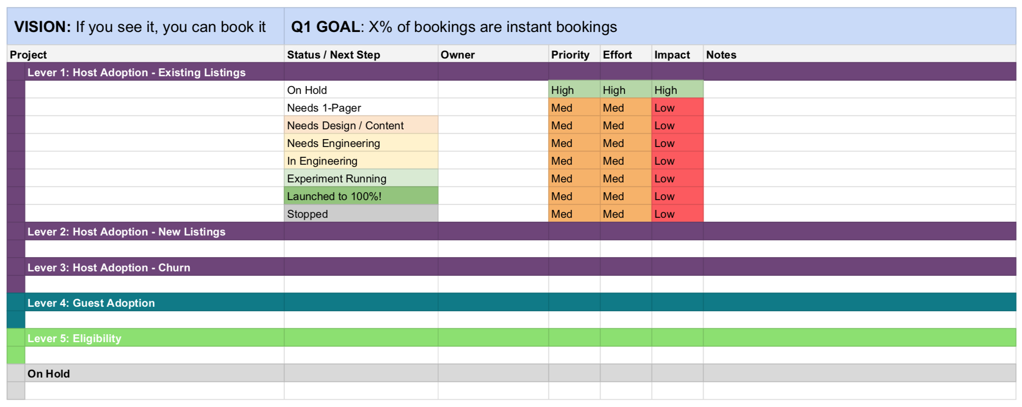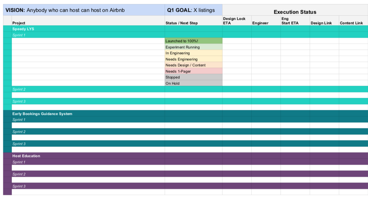 Yes! Here you go! This is courtesy of my former Airbnb colleague, Andrew Chen (not that Andrew Chen), who had some of the most thoughtful and well-executed roadmaps of any PM I’ve ever worked with. I’ve tried a lot of different tools over the years, and I always find myself always coming back to Google Sheets 🤷♂️