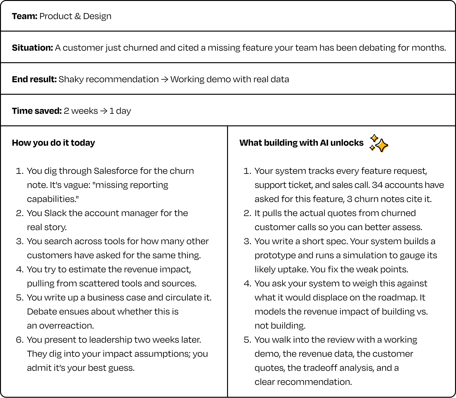 I hear this from executives, from managers, from ICs, from technical and non-technical people alike. From people with jobs, people looking for work, students, entrepreneurs, stay-at-home-moms. They’re all underwater and hungry for more leverage, but it’s not totally clear how to go from “asking it questions” to something that meaningfully gives them time back—especially when investing that initial effort takes time away from work they already know how to do.